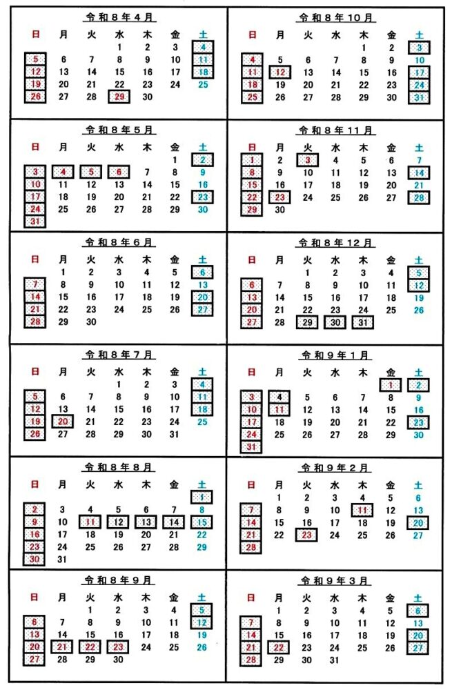令和8年4月からの年間カレンダーが出来ましたので、掲載させていただきます。